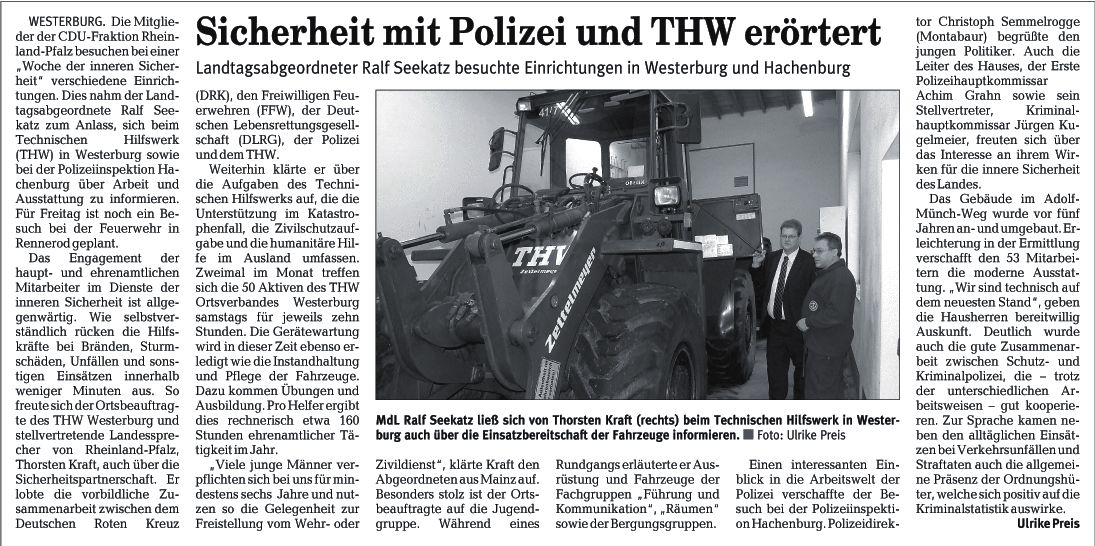 WESTERBURG. Die Mitglieder der CDU-Fraktion Rheinland-Pfalz besuchen bei einer "Woche der inneren Sicherheit" verschiedene Einrichtungen. Dies nahm der Landtagsabgeordnete Ralf Seekatz zum Anlass, sich beim Technischen Hilfswerk (THW) in Westerburg sowie bei der Polizeiinspektion Hachenburg über Arbeit und Ausstattung zu informieren. Für Freitag ist noch ein Besuch bei der Feuerwehr in Rennerod geplant.