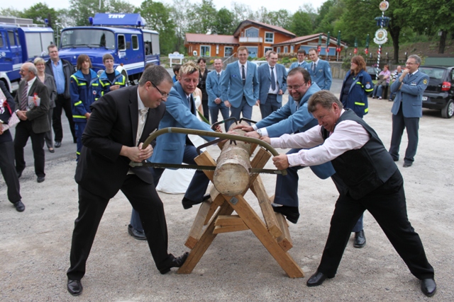 Pünktlich um 18:30 Uhr fuhr das Brautauto vor das Cafe und dann musste Zugführer Huff seinen Mannschaftstansportwagen mit der Braut ziehen. Unter dem Applaus der Mannschaft bewältigte er die Strecke von gut zwanzig Meter und der kleinen Steigung. Anschließend wartete das traditionelle Holzsägen auf die Beiden. Hier sprang kurzerhand der Brautvater ein. Die Bügelsäge hielt aber dem Druck nicht stand und so kam kurzerhand die Motorsäge zum Einsatz, die zur Freude der Kameraden allerdings nicht ohne "Nutzungsgebühr" abgegeben werden konnte.