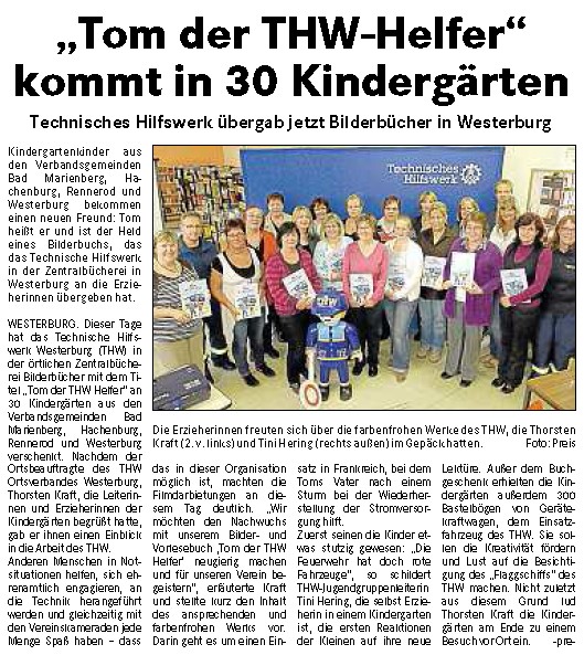 WESTERBURG. In der Zentralbücherei Westerburg übergaben der Ortsbeauftragte Thorsten Kraft und sein THW-Team dreißig Vorlesebücher mit dem Titel „Tom, der THW-Helfer“ an Vertreterinnen der kommunalen und kirchlichen Kindergärten. Dieses Bilder- und Vorlesebuch handelt von einem Einsatz des THW in Frankreich nach einem Sturm und ist speziell für Kinder ab einem Alter von drei Jahren geeignet. Die Aktualität der THW-Arbeit zeigte sich gerade in diesen Tagen, als ein neues Hochwasser an der Oder zu einem größeren Einsatz des THW in Deutschland und in Polen führte. „Eine solche Katastrophe kann immer geschehen. Gut, wenn dann Hilfe da ist“, meint Kraft, der selbst 1997 im Hochwasser an der Oder im Einsatz war.