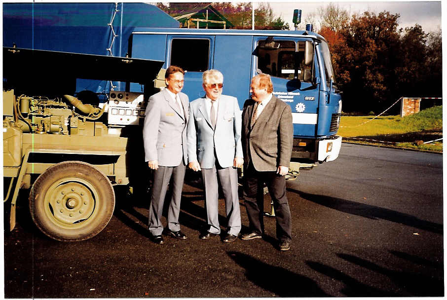 "Der Ortsverband Westerburg erhält vom Länderverband Berlin, Brandenburg, Sachsen-Anhalt ein Elektroaggregat." Dieses Versprechen, das dem Ortsbeauftragten Günther Seekatz gemacht worden war, ist erfüllt worden. Der Landesbeauftragte Metzger des Länderverbandes Berlin, Brandenburg, Sachsen-Anhalt ließ es sich nicht nehmen, persönlich dieses Versprechen einzulösen. Vier Männer des Ortsverbandes Wittenberge incl. des OB Wolfgang Görcke brachten das Stromaggregat (50 kVA, NVA) in den Westerwald. Der Termin bot sich an, da an diesem Wochenende im Ortsverband der traditionelle "Bayerische Abend" anstand. Bei gemütlicher Atmosphäre und stimmungsvoller Dekoration entwickelte sich ein zünftiges Fest, das wie jedes Jahr ein besonderer Höhepunkt für die Helfer, Freunde und Gäste des Ortsverbandes Westerburg ist. Am Samstag Morgen wurde das Aggregat offiziell dem OV Westerburg übergeben. Gleich beim ersten Startversuch sprang der Dieselmotor an und man konnte das Leistungsvolumen von 50.000 Watt erahnen.