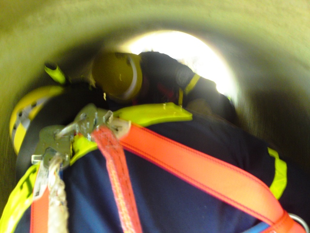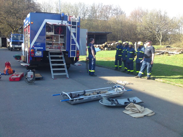 Gut gestärkt aus der Mittagspause stand der zweite Durchgang an. Am Ende der praktischen Aufgaben wurde noch die sogenannte Teamprüfung abgenommen. In diesem Test wird besonders auf die Zusammenarbeit und die Abläufe sowie die Befehlsstruktur geachtet. Als Aufgabe stand die Bergung einer Person an, die in einem Rohr verunglückt ist. Diese Aufgabe erforderte unter den beengten Arbeitsverhältnissen besondere Anstrengung, bis kurz vor 18:00 Uhr das Gesamtgergebnis feststand: