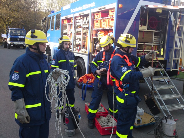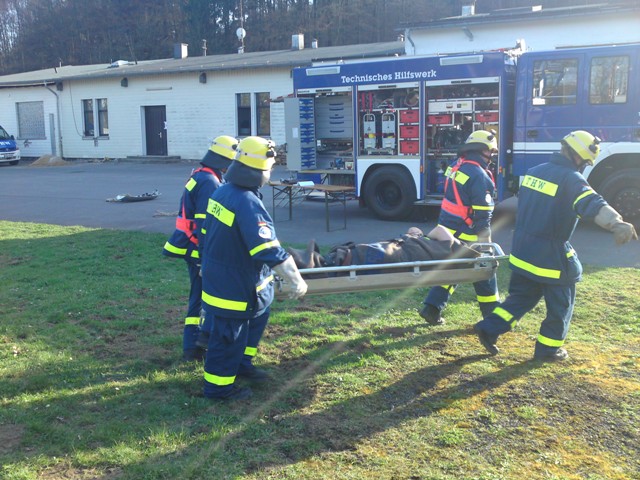 Die Grundausbildung im Ortsverband Westerburg geht in die entscheidene Phase. Am Wochenende wurde die Zwischenprüfung auf dem Gelände des Ortsverbandes abgenommen. In Theorie und Praxis mussten sich die vier Helferanwärter an diesem Tag beweisen. Das Wetter bot eine hervorragende Ausgangssituation. Bei stahlendem Sonnenschein warteten die Materialablagen bei den Prüfungsstationen auf die Helferanwärter, die dort ihre Aufgaben unter prüfungsähnlichen Bedingungen erledigen konnten. Doch bevor der praktische Teil anstand, mussten zunächst die vierzig Prüfungsfragen in der Theorie bewältigt werden. Unterbrochen durch das Frühstück begann dann unter den kritischen Augen der Stationsbetreuer der Rotationsdurchgang durch die diversen Aufgaben: Ablängen von Rohren, Kürzung eines Holzbalkens, Bedienung eines Funkgerätes, Sichern einer Person auf der Trage, Aufbau und Inbetriebnahme eines Flutlichtstrahlers auf einem Dreibeinstativ waren nur einige der vielen Aufgaben. An oberster Stelle stand die Bewertung der genauesten Beachtung von sicherheitsrelevanten Dingen.