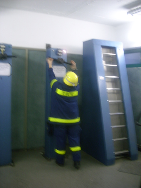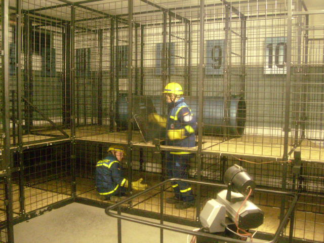Am Nachmittag erfolgte dann eine realistische Einsatzübung für die ausgebildeten AGT-Trupps auf dem Gelände des Ortsverband. Das Holzlager im Bereich der THW-Unterkunft war hierzu entsprechend Tage zuvor vorbereitet und umgestaltet worden. Mit einer speziellen Maschine wurden die Räumlichkeiten komplett vernebelt, man sah die Hand nicht mehr vor den Augen. Den AGT-Trupps wurde beim Eintreffen die Lage mit einer Gebäudeexplosion beschrieben, mehrere Menschen waren zum Zeitpunkt der Explosion noch im Gebäude und werden vermisst, das Gebäude weist zudem starke Rauchentwicklungen auf, es bestehen Gefahren durch weitere Schadstoffe und nicht abgeschaltete Stromversorgung. Diese Ausgangslage galt es nun abzuarbeiten. Unter Beachtung und Beseitigung der v. g. Gefahrenlage wurden dann die entsprechenden Hilfsmaßnahmen eingeleitet, die vermissten und zum Teil schwer verletzten Personen im Gebäude wurden aufgefunden und aus dem Gebäude mit Hilfe eines Einsatz-Gerüstsystems (EGS) (hier musste ein Hindernis überwunden werden) nach draußen gebracht, wo sie dem Sanitätsdienst übergeben wurden.