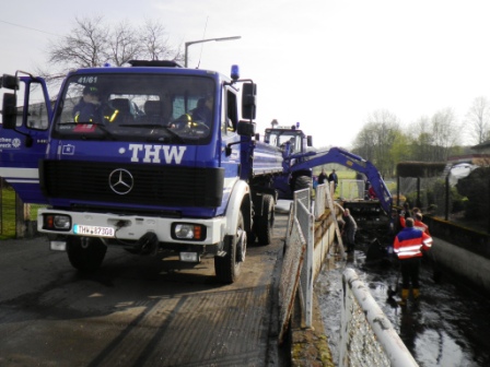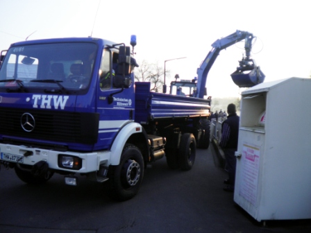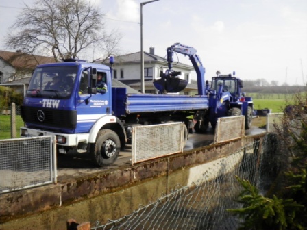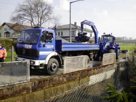 Auch in 2012 wurden die Reinigungsarbeiten des Löschwasserbehälters in Winnen wieder in einer Gemeinschaftsarbeit zwischen der freiwilligen Feuerwehr Winnen und dem Technischen Hilfswerk Westerburg durchgeführt. Am Samstag den 14.04.2012 ab 6:30 Uhr begann die Räumgruppe mit dem Entfernen der angespülten Schlamm- und Geröllmassen. Mittels Bergungsräumgerät und Zweischalengreifer wurden die Ablagerungen auf den Kipper verladen und dann entsorgt. Aufgrund der guten Zusammenarbeit mit den Kameraden der Feuerwehr Winnen konnten die Arbeiten schnell erledigt werden. So kam es, dass der Löschwasserbehälter bereits gegen Mittag wieder befüllt werden konnte. Zum Abschluss wurde noch eine Baubude auf das Baugelände des neuen Feuerwehrgerätehauses befördert. Das interessante Blechbauwerk mit Überbreite musste mittels Kipper quer durch Winnen über die Hauptstraße befördert werden.