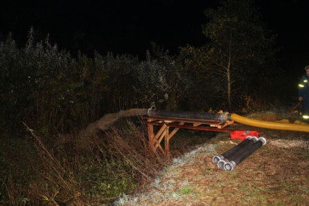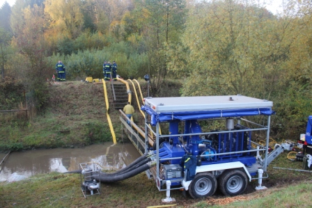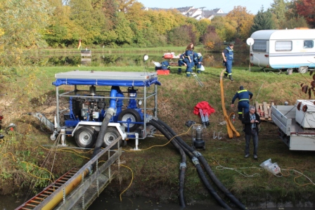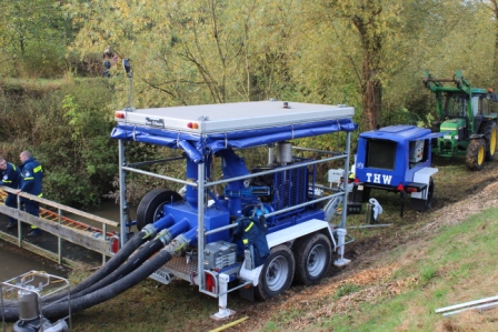 Mit dem Ablassen des Wiesensees wird gegen Ende der Aktion viel Schlamm gelöst und aus dem See in den Ablauf und damit in den Seebach geschwemmt. Damit dies nicht zu einer starken Gewässerverunreinigung in den Unterläufen führt, gelten für das Abfischen strenge Umweltvorschriften. Das verunreinigte Wasser muss vor der weiteren Einleitung zunächst in einen stillgelegten Fischteich gepumpt werden, wo es sich absetzen kann. In diesem Jahr konnte die Verbandsgemeinde Westerburg, als Eigentümer der Gewässer, wiederrum auf die Unterstützung des THW zurückgreifen. Im Vorfeld war berechnet worden, mit welcher Leistung, das Wasser abgepumpt werden müsse, damit sowohl eine geregelte Fischbergung als auch das Auffangen des Wassers möglich wird. Diese Anforderung gleichzeitig zu erfüllen erfordert eine hohe Pumpreserve, da die Schleusen vom See in den Abfischgraben immer nur stossweise geöffnet werden. Das THW Westerburg wurde bei dieser Aufgabe von dem Ortsverband Betzdorf unterstützt. Für den Gesamteinsatz war der Westerburger Gruppenführer Björn Serowi verantwortlich.Neben drei Elektro-Tauchpumpen mit einer jeweiligen Leistung von 3000 L/min. wurde die beim THW in Betzdorf stationierte große Havariepumpe mit der unglaublichen Förderleistung von 15.000 L/ min in den Einsatz gebracht. Diese Pumpe ist bei den Hochwassern an der Oder und Elbe, in Polen und bei der Überschwemmung in New Orleans eingesetzt worden. So konnten 400 l Schmutzwasser in der Sekunde abgepumpt werden, so dass der Wasserstand im Abfischgraben trotz Öffnung der Schleuse konstant blieb. Damit das Wasser ohne große Schäden am Teichrand zu verursachen, gepumpt werden konnte, hatten die THW-Helfer am Abend zuvor eine Holzkonstruktion in Form eines Steges gebaut. Darauf konnte das Austrittsrohr mit einem Durchmesser von 30 cm sehr gut befestigt werden. Die durch die untere Wasserbehörde der Kreisverwaltung und der Gewässeraufsicht von der SGD Nord, Abteilung Wirtschaft Montabaur durchgeführten Kontrolle konnte festgestellt werden, das in diesem Jahr kein verschlammtes Wasser in den Seebach gelangt ist. „Die Pumpleistung entspricht genau dem, was erforderlich ist, um das mit Schlamm versetzte Wasser in das sog. Absetzbecken zu fördern“ so Thomas Meuer von der SGD Nord. Die Erfahrungen von diesem Jahr werden in die Planung für das Jahr 2013 einbezogen.