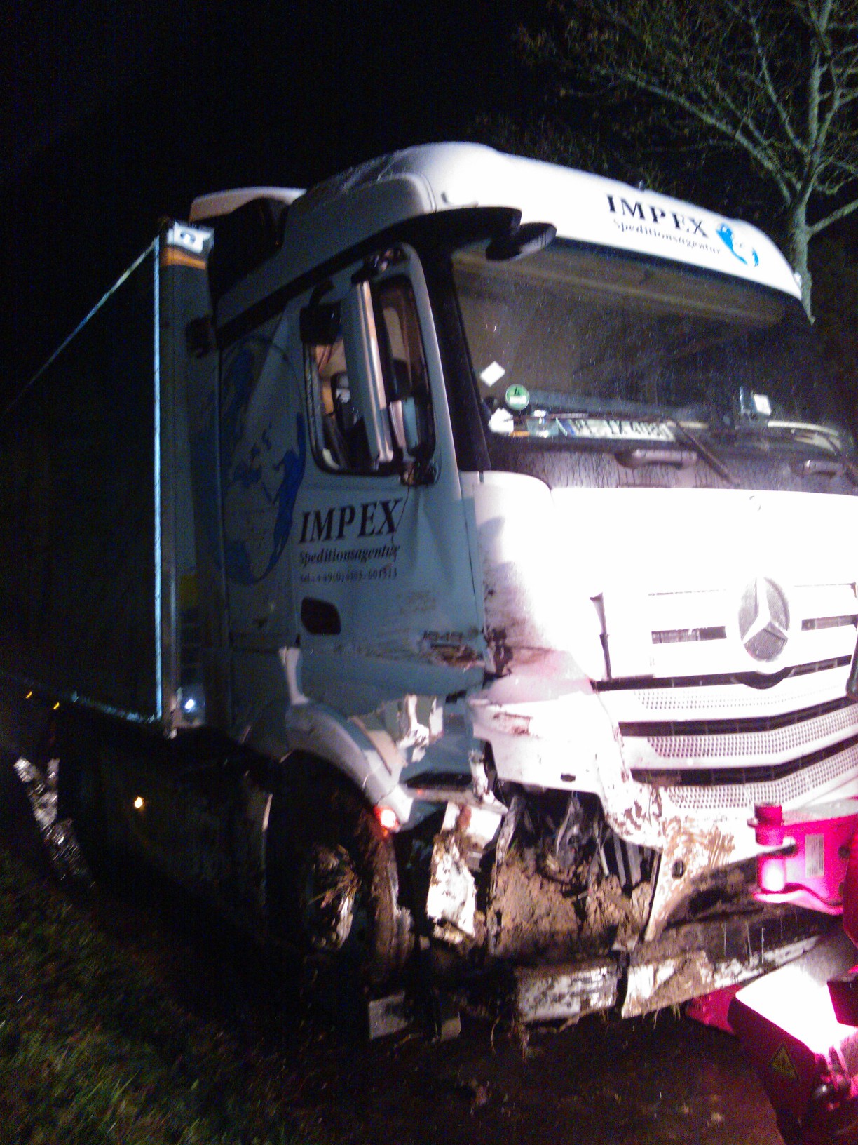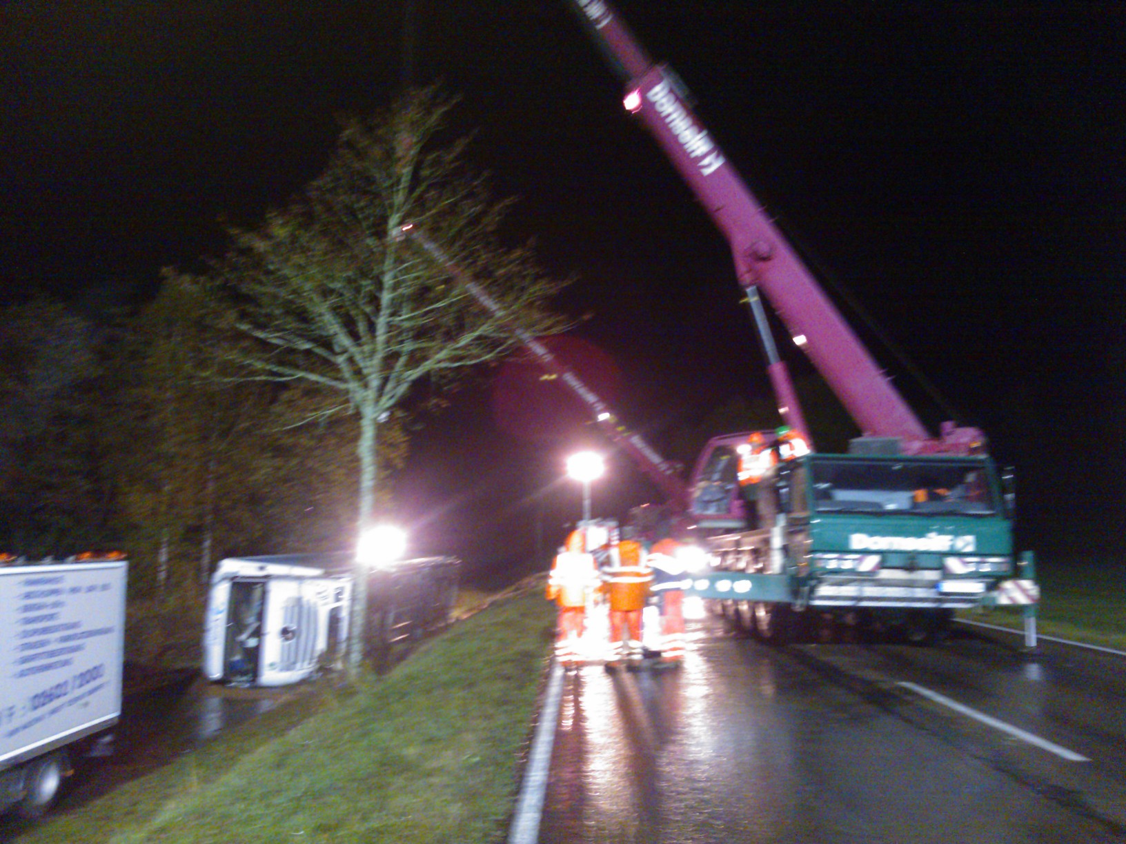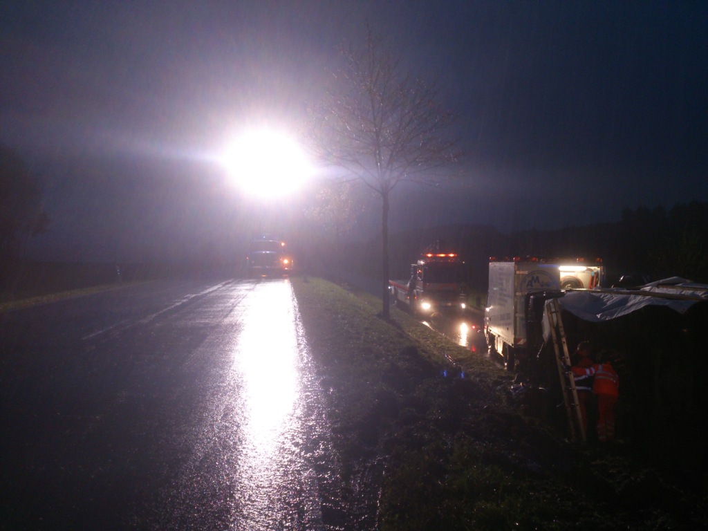Das THW Westerburg wurde am 04.11.2013 zur Unterstützung bei der Bergung eines havarierten Sattelzuges, der auf der B54 zwischen Irmtraut und Waldmühlen von der Fahrbahn abgekommen und auf der Seite verunfallte, hinzugeholt. Die Aufgabe des THW bestand in der großflächigen Ausleuchtung der Schadensstelle. Mit zwei Autokranen wurde ein Bergungsunternehmen beauftragt, den LKW zunächst aufzurichten um ihn dann auf die Straße oberhalb der Unglücksstelle zu bewegen. Die Anfrage erreichte den Ortsverband gegen 14:00 Uhr. Planmäßig um 16:00 Uhr rückte der Lichtmastkraftwagen aus. Nachdem der Landesbetrieb Mobilität die B54 vollständig für den Verkehr gesperrt hatte, konnten die Krane positioniert werden. Mit dem Einbruch der Dämmerung wechselte auch das Wetter in einen starken Regen. Umso wichtiger war es, genügend Licht an der Einsatzstelle zu haben. Die Scheinwerfer des Lima-KW leisteten diesen Dienst gut und gewohnt zuverlässig. Ein LKW-Abschleppunternehmen übernahm den verunfallten LKW. Der Einsatz war gegen 22:00 Uhr beendet.