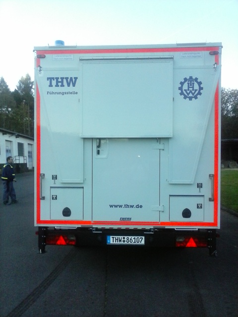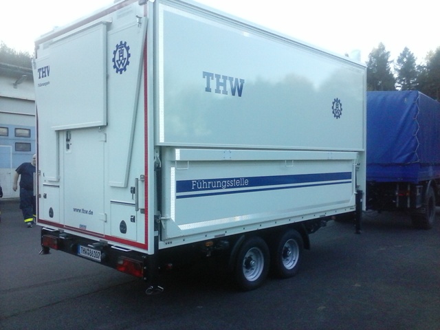 Damit erweitert der Ortsverband Westerburg nunmehr seine Möglichkeiten, auch in Großschadenslagen eine Führungsstelle ortsunabhängig zu betreiben. Der Anhänger ist das Herzstück einer THW Führungsstelle und dient dazu, von dort aus die Entscheidungen für die THW Einheiten, deren Materialversorgung, Einsatzplanung und die Gesamtlage in einem großen oder sehr großem Einsatz, wie beispielsweise dem letztjährigem Hochwasser an der Elbe, zu treffen. Dazu müssen alle Informationen dort zusammenlaufen. Der Anhänger wird jeweils an den Seiten ausgeklappt. So entsteht ein Führungsraum von knapp fünf auf fünf Meter der dann ausreichend ist, dass eine Führungsmannschaft von sechs Personen jeweils einen Arbeitsplatz besetzen kann. Der Anhänger ist dementsprechend mit Karten, Funk- und Telekommunikationsverbindungen etc. ausgestattet. Damit ein Betrieb sowohl im Sommer, als auch im Winter möglich ist, verfügt der Anhänger über eine separate Heizung, als auch über eine Klimatisierung. Es handelt sich bei dem übergebenen Modell um die dritte Baureihe, die eine Reihe von Verbesserungen gegenüber den bisherigen Baureihen enthält und damit auf dem neuesten Stand der Technik ist.