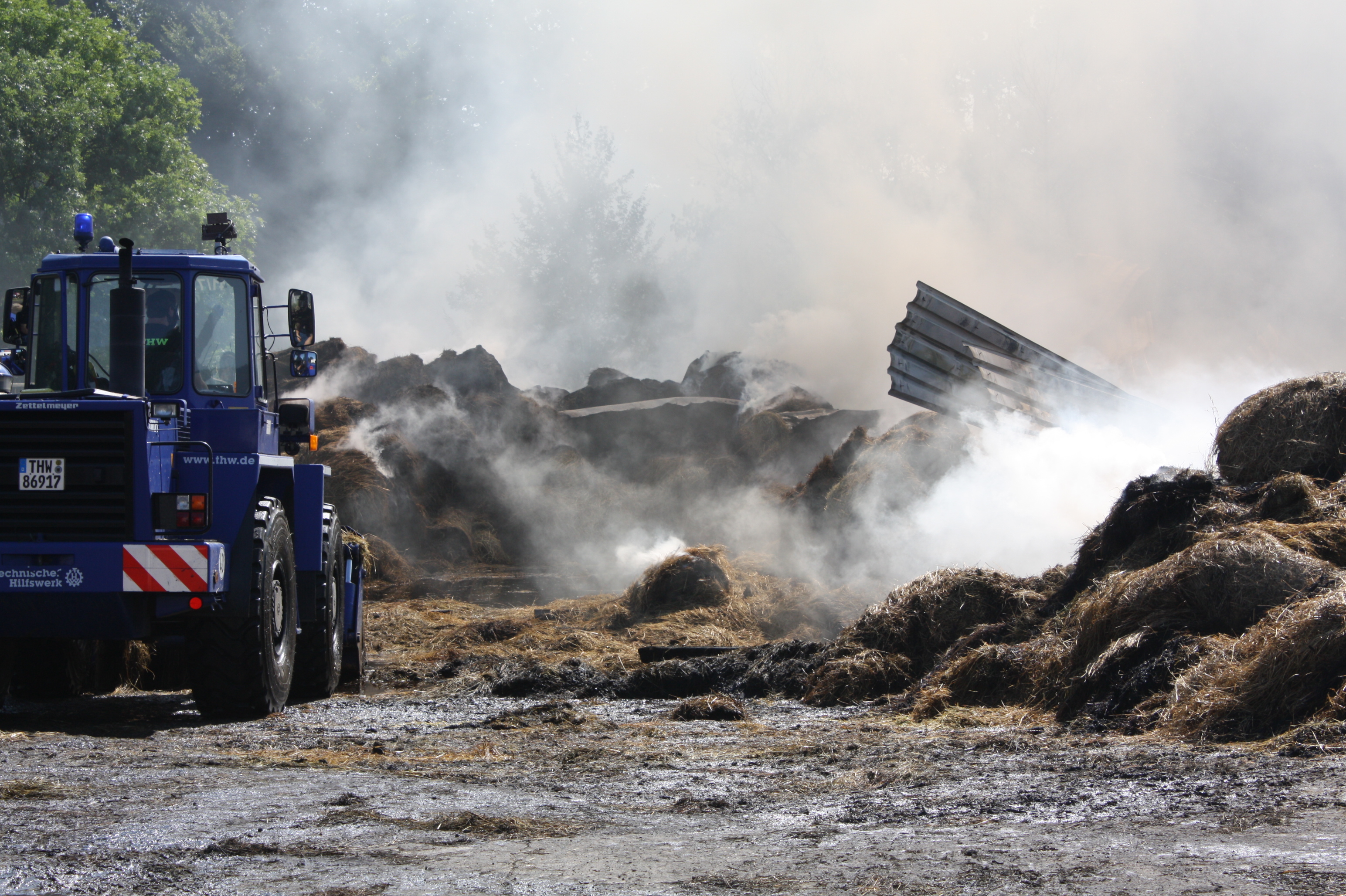Das Zusammenspiel aller Kräfte, insgesondere mit den Löschtrupps der Feuerwehr, die die brennenden Ballen ablöschten und den Wirkbereich des Radladers kühlten sowie die Koordination mit der Wehr- und Einsatzleitung vor Ort funktionierte wie gewohnt einwandfrei. Der Ortsverband konnte um 20:00 Uhr am Montag von der Einsatzstelle abrücken und um 22:00 Uhr war schließlich der Einsatz beendet.