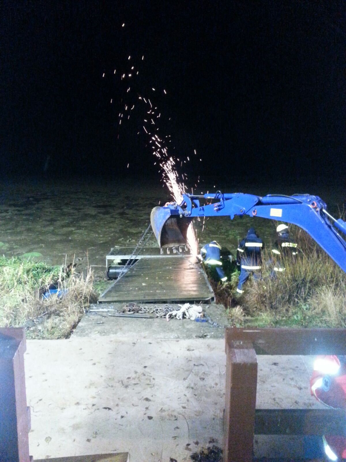 Da die Arbeiten an einem Abend stattfanden, nahmen wir es als Anlass für die Bergungsgruppen eine kleine Übung im Bereich: "Ausleuchten von Einsatzstellen" durchzuführen. Dank des Lichtmastkraftwagens war der Bereich innerhalb weniger Minuten taghell ausgeleuchtet. Wege und Rangierflächen wurden zusätzlich durch Beleuchtungskomponenten des Gerätekraftwagens 2 beleuchtet. Die Verstärkung durch die Bergungsgruppe und den Gerätekraftwagen 2 zeigte sich nicht nur im Bereich Beleuchtung von Vorteil. Die Schraubverbindungen der einzelnen Stegteile konnten nicht mehr gelöst werden und wurden daher mittels Motortrennschleifer abgetrennt.