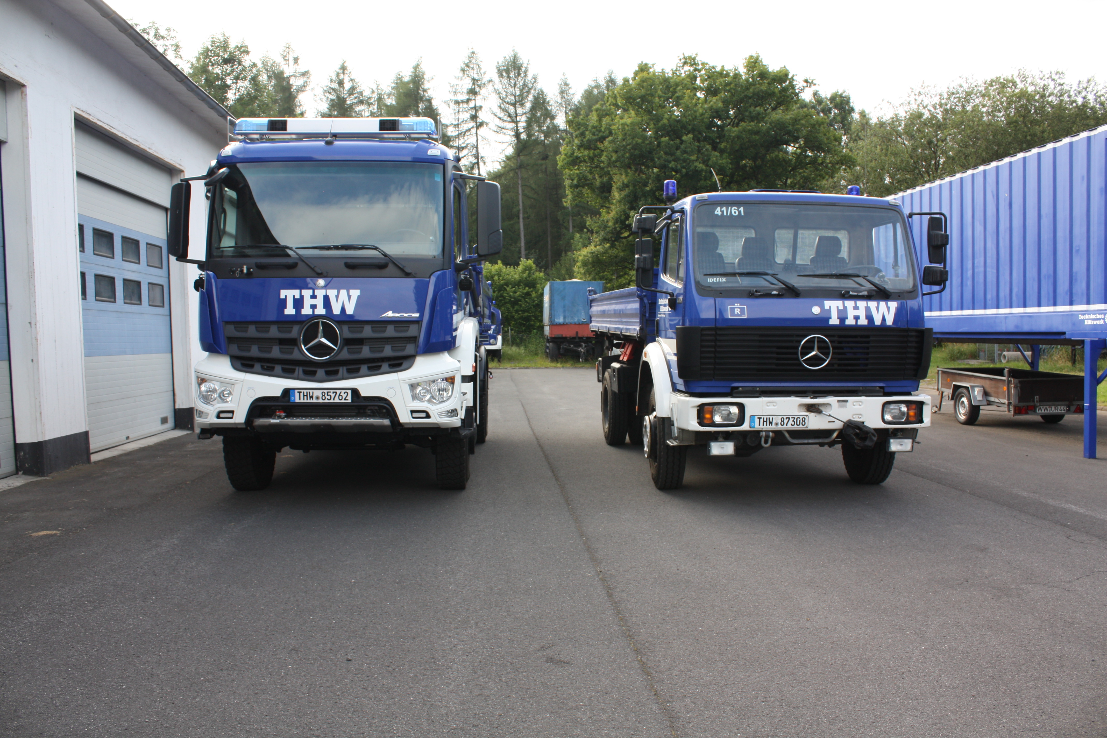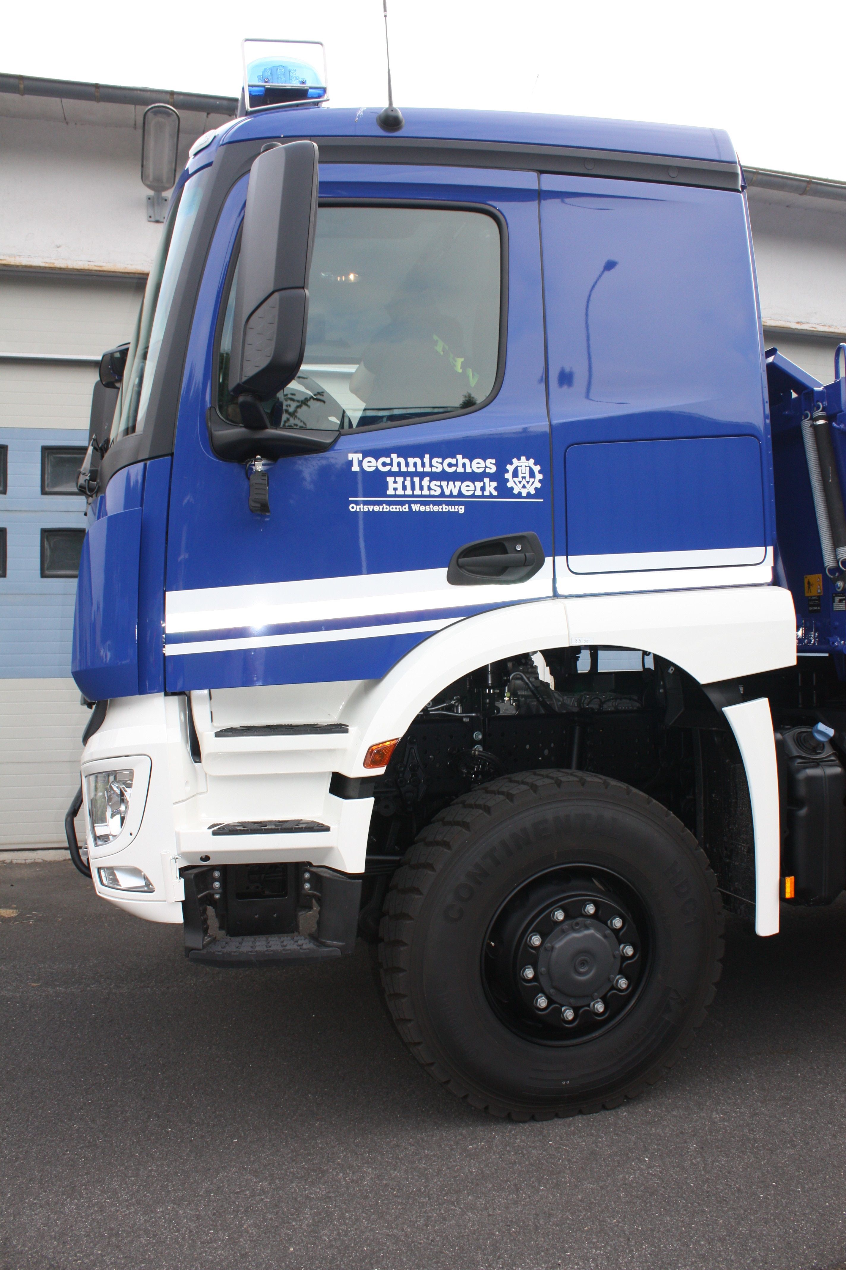 Mit dem neuen Kipper steht nunmehr eine leistungsfähige Zugmaschine zur Verfügung. Der bisherige Kipper war mit einer Leistung von 170 PS und einer möglichen Beförderung eines Bergungsräumgerätes incl. Tieflader und weiteren schweren Zubehörteilen in unserer Mittelgebirgsregion am Leistungslimit. Nunmehr stehen 350 PS zur Verfügung. Das Fahrzeug ist ein handelsüblicher Mercedes Benz Arocs 1835, der als Sonderausstattung eine etwas größere Fahrerkabine sowie Blaulichtanlage und Digitalfunk erhalten hat.